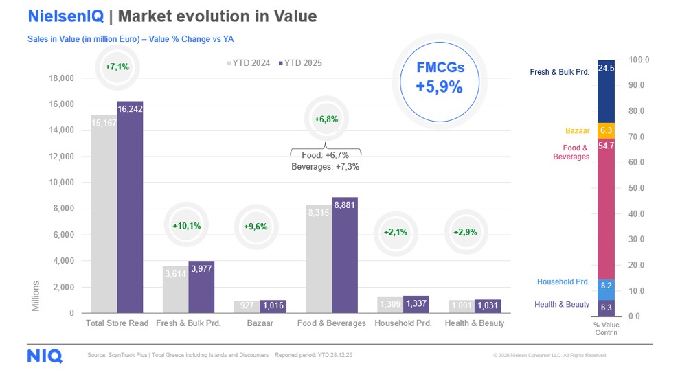 Με βάση τα πιο πρόσφατα στοιχεία μετρήσεων της NielsenIQ για το σύνολο του 2025, θετική τάση της τάξεως του +7,1% παρουσίασε ο τζίρος του οργανωμένου λιανεμπορίου τροφίμων*, με την αυξημένη ζήτηση να αποτελεί τον κύριο μοχλό ανάπτυξης του κλάδου, οι συνολικές πωλήσεις, του οποίου ανήλθαν στα 16,2 δισ. ευρώ.
