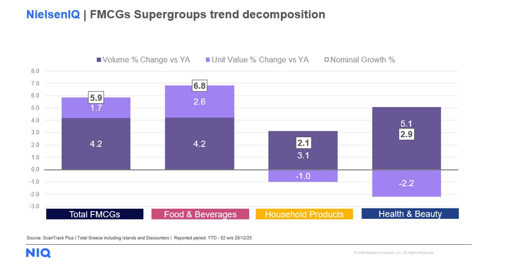 Αναλύοντας τα δεδομένα της αγοράς περαιτέρω, ιδιαίτερα ενδιαφέρον είναι το γεγονός ότι μόνο στις υπερ-κατηγορίες των τυποποιημένων τροφίμων & ποτών υπάρχει ανάπτυξη της μέσης τιμής τους (+2,6%), ενώ στις υπερ-κατηγορίες των μη τροφίμων εξακολουθούμε να έχουμε αποπληθωριστικές τάσεις, όπως συνέβαινε και το 2024, με τα Προϊόντα Φροντίδας του Σπιτιού να μείωσαν περαιτέρω τη μέση τιμή τους κατά -1,0%, καθώς και τα Προϊόντα Προσωπικής Υγιεινής και Ομορφιάς κατά -2,2%.
