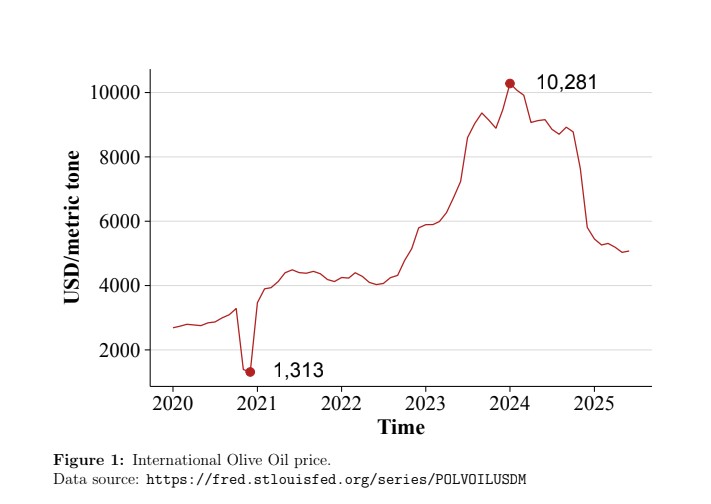 Έκτοτε, η τιμή έχει μειωθεί και τον Ιούνιο του 2025 διαμορφώθηκε στα 5.075 δολάρια ΗΠΑ ανά μετρικό τόνο. Γενικά, οι γεωπολιτικές εντάσεις καθώς και η κλιματική αλλαγή συνέβαλαν στην αύξηση του πληθωρισμού στον τομέα των τροφίμων (Saccone και Vallino, 2025).