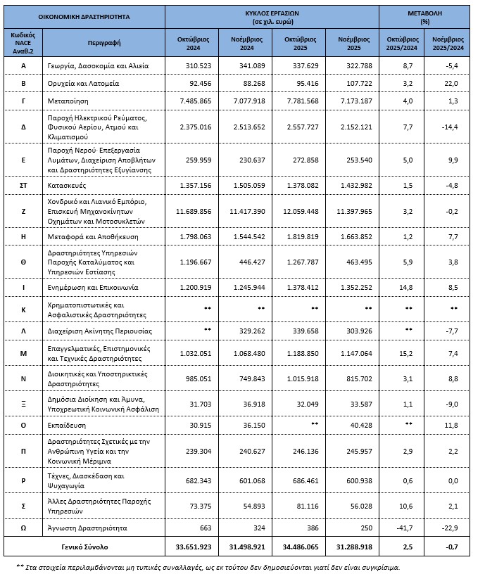 Η Ελληνική Στατιστική Αρχή (ΕΛΣΤΑΤ) ανακοινώνει στοιχεία που αφορούν στην εξέλιξη του κύκλου εργασιών των επιχειρήσεων όλων των κλάδων δραστηριότητας της οικονομίας, με ενσωμάτωση των πιο πρόσφατων στοιχείων για τον κύκλο εργασιών από Διοικητικές Πηγές, Νοεμβρίου 2025.