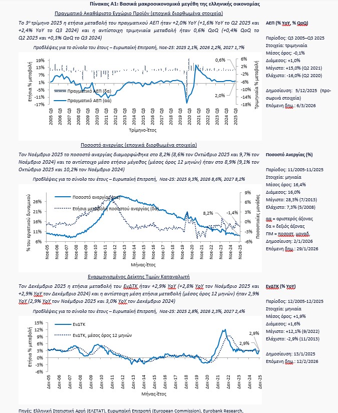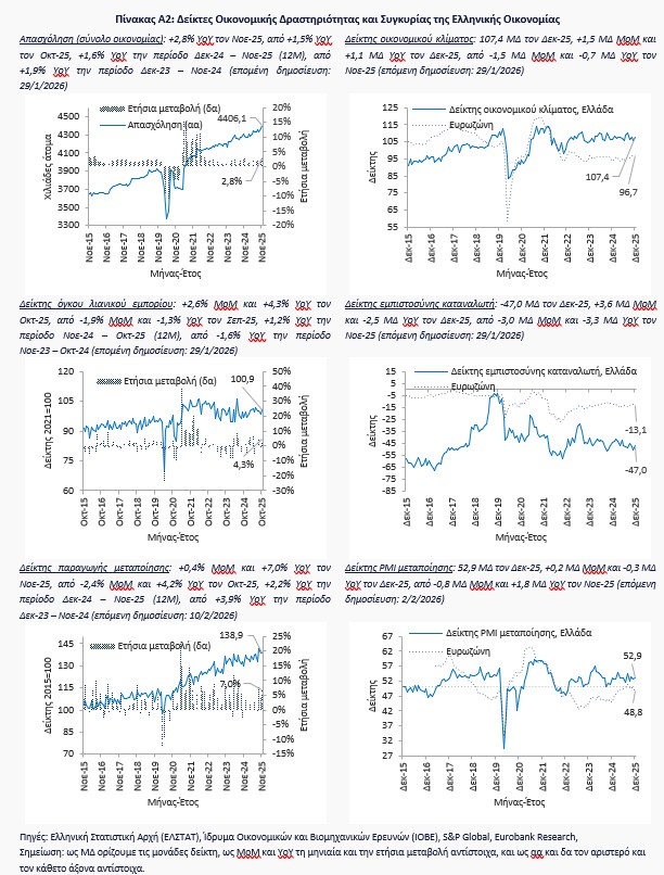 Αυτή την περίοδο δημοσιεύονται οι τελευταίες παρατηρήσεις μιας σειράς βασικών δεικτών της ελληνικής οικονομίας για το έτος 2025. Στις 6 Μαρτίου 2026 αναμένεται να ανακοινωθούν από την Ελληνική Στατιστική Αρχή (ΕΛΣΤΑΤ) οι εθνικοί λογαριασμοί του δ’ τριμήνου 2025, η πρώτη εκτίμηση των εθνικών λογαριασμών του 2025, καθώς και τα αποτελέσματα της τριμηνιαίας έρευνας εργατικού δυναμικού για το δ’ τρίμηνο του 2025.