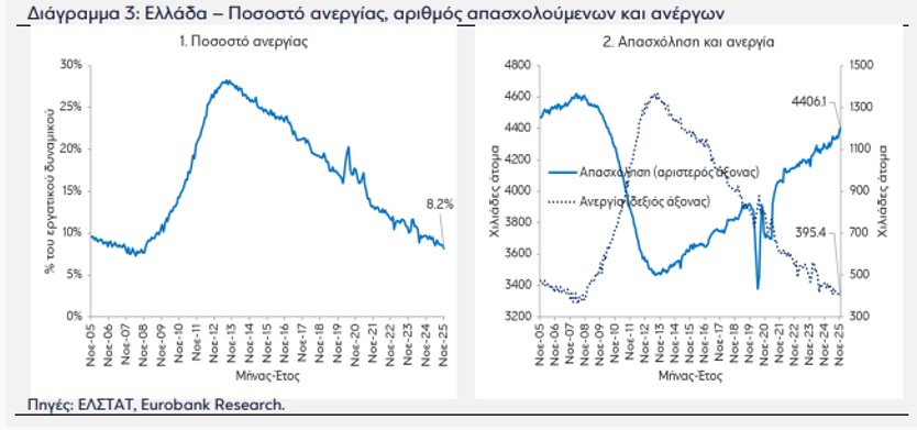 Στο πεδίο των «σκληρών» δεδομένων (hard data), το δίμηνο Οκτωβρίου–Νοεμβρίου 2025 το μέσο ποσοστό ανεργίας διαμορφώθηκε στο 8,4% του εργατικού δυναμικού (εποχικά διορθωμένα στοιχεία), από 8,7% το γ΄ τρίμηνο του 2025 και 9,7% το αντίστοιχο δίμηνο του 2024.