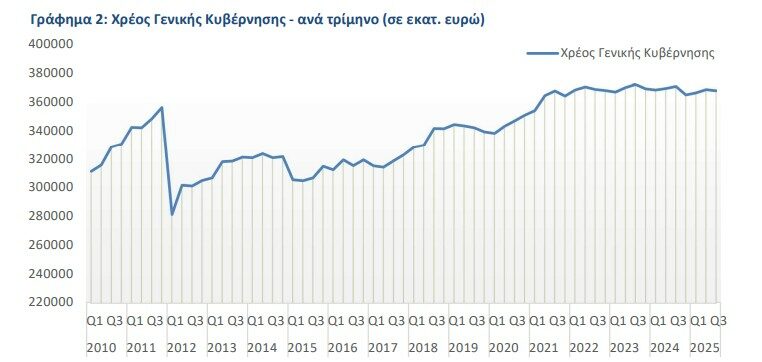 Μικρή μείωση κατά 0,8% κατέγραψε το δημόσιο χρέος το το γ’ τρίμηνο 2025. Διαμορφώθηκε στα 367,852 δισ. ευρώ διαμορφώθηκε έναντι 370,820 δισ. ευρώ το αντίστοιχο τρίμηνο του 2024, όπως προκύπτει από τους τριμηνιαίους μη Χρηματοοικονομικούς Λογαριασμούς της Γενικής Κυβέρνησης από την ΕΛΣΤΑΤ.