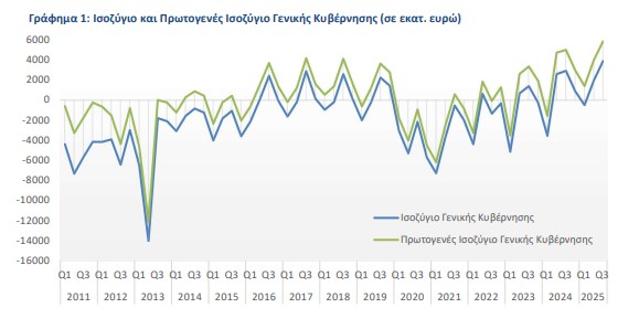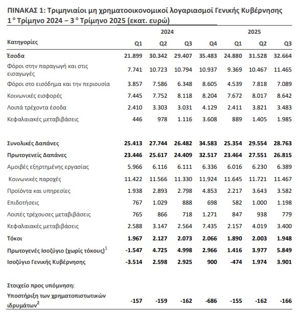 Σύμφωνα με την ΕΛΣΤΑΤ, τα έσοδα της Γενικής Κυβέρνησης ανήλθαν σε 32,664 δισ. ευρώ από 29,407 δισ. ευρώ το γ’ τρίμηνο του 2024. Οι φόροι στο εισόδημα και την περιουσία διαμορφώθηκαν σε 7,089 δισ. ευρώ από 6,348 δισ. ευρώ. Οι φόροι στην παραγωγή και στις εισαγωγές ήταν 11,465 δισ. ευρώ από 10,794 δισ. ευρώ. Ενώ, οι κοινωνικές εισφορές ανήλθαν σε 8,642 δισ. ευρώ από 8,118 δισ. ευρώ το γ’ τρίμηνο του 2024.