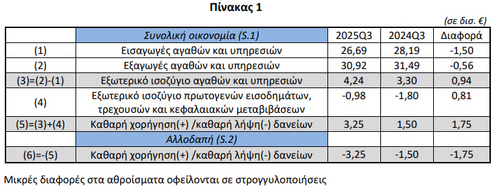 Κατά το γ’ τρίμηνο του 2025 καταγράφηκε πλεόνασμα στο εξωτερικό ισοζύγιο αγαθών και υπηρεσιών 4,24 δισ. ευρώ, έναντι πλεονάσματος 3,30 δισ. ευρώ που είχε καταγραφεί το γ’ τρίμηνο του 2024.