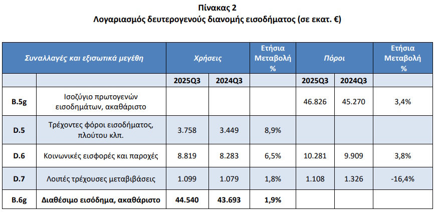 Κατά το 3ο τρίμηνο του 2025, το διαθέσιμο εισόδημα του τομέα των νοικοκυριών και των μη κερδοσκοπικών ιδρυμάτων που εξυπηρετούν νοικοκυριά (ΜΚΙΕΝ) αυξήθηκε κατά 1,9% σε σύγκριση με το αντίστοιχο τρίμηνο του προηγούμενου έτους, από 43,69 δισ. ευρώ σε 44,54 δισ. ευρώ.