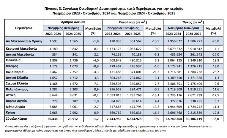 Κατά την περίοδο των τελευταίων δώδεκα μηνών, δηλαδή από τον Νοέμβριο 2024 έως τον Οκτώβριο 2025, το μέγεθος της Συνολικής Οικοδομικής Δραστηριότητας (Ιδιωτικής-Δημόσιας) με βάση τις εκδοθείσες οικοδομικές άδειες, στο σύνολο της Χώρας, ανήλθε σε 29.912 οικοδομικές άδειες, που αντιστοιχούν σε 6.524.928 m2 επιφάνειας και 30.106.119 m3 όγκου. Σε σχέση με την αντίστοιχη περίοδο Νοεμβρίου 2023 – Οκτωβρί ου 2024 παρατηρήθηκε μείωση κατά 1,7% στον αριθμό των οικοδομικών αδειών, μείωση κατά 9,9% στην επιφάνεια και μείωση κατά 8,0% στον όγκο.