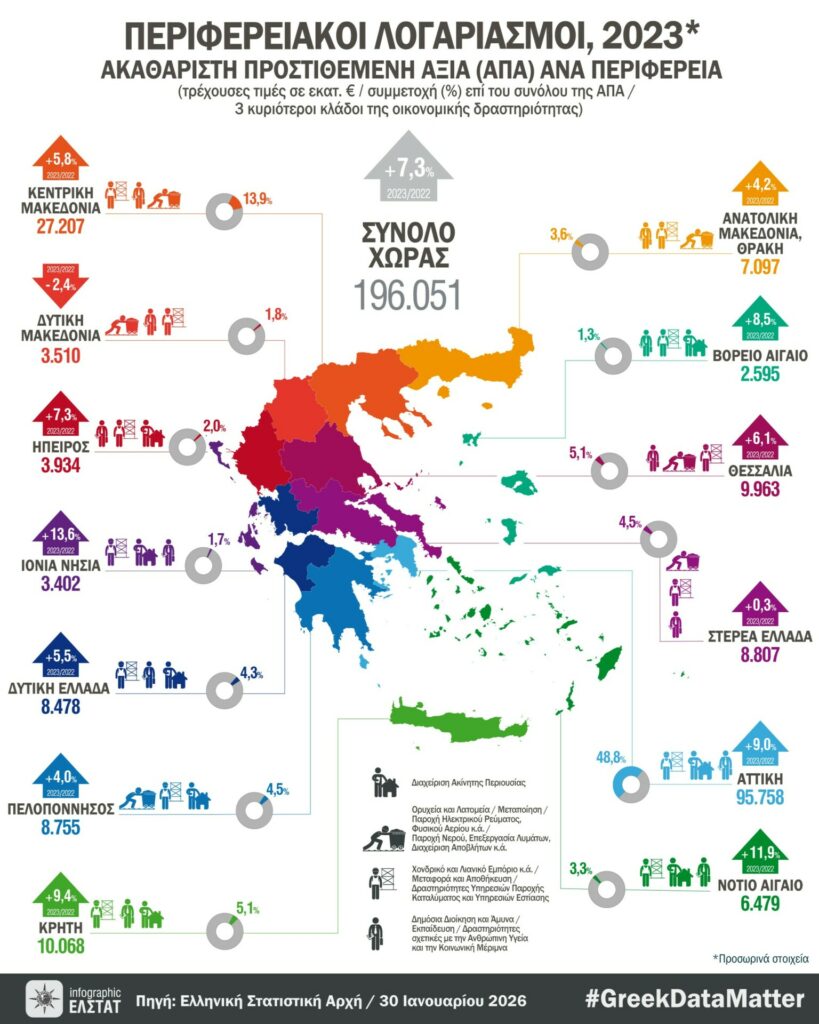 Σύμφωνα με τα στοιχεία των Περιφερειακών Λογαριασμών που δημοσίευσε η ΕΛΣΤΑΤ για το έτος 2023, η ελληνική οικονομία εμφανίζει μια σαφή τάση αποκέντρωσης της ανάπτυξης, με τις νησιωτικές περιοχές και την Κρήτη να αναδεικνύονται σε ισχυρούς «πρωταγωνιστές» της εγχώριας οικονομικής δραστηριότητας.