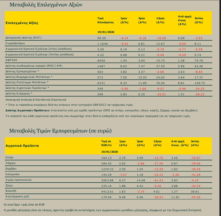 Ο δείκτης των αγροτικών προϊόντων υποχώρησε τον Ιανουάριο κατά 0,90%, την ώρα που ο δείκτης των εμπορευμάτων ενισχύθηκε κατά 3,82%. Η διαφοροποίηση αυτή αποτυπώνει την επίδραση ευνοϊκότερων μακροοικονομικών και εμπορικών συνθηκών στο σύνολο των εμπορευμάτων, όπως η υποχώρηση του δολαρίου και η σταθεροποίηση των διμερών σχέσεων ΗΠΑ-Κίνας, οι οποίες ενίσχυσαν τη ζήτηση στηρίζοντας ανοδικά τις τιμές.