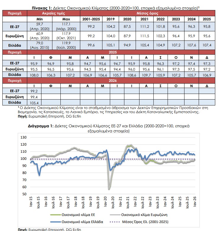 Ο δείκτης οικονομικού κλίματος υποχώρησε ελαφρά τον Ιανουάριο, καθώς διαμορφώνεται στις 105,4 μονάδες, από 106,9 μονάδες τον Δεκέμβριο, σύμφωνα με τα στοιχεία που ανακοίνωσε ο ΙΟΒΕ.. Η επιδείνωση προέρχεται από εξασθένιση των προσδοκιών στις Υπηρεσίες και την πτωτική τάση της καταναλωτικής εμπιστοσύνης, με τις προσδοκίες στη Βιομηχανία να παραμένουν ουσιαστικά αμετάβλητες. Αντίθετα, στις κατασκευές, τα ιδιωτικά έργα συνεχίζουν την ανοδική τους πορεία με τον σχετικό δείκτη να φτάνει σε μια από τις υψηλότερες επιδόσεις διαχρονικά, ενώ στο Λιανεμπόριο σημειώνεται μικρή βελτίωση.