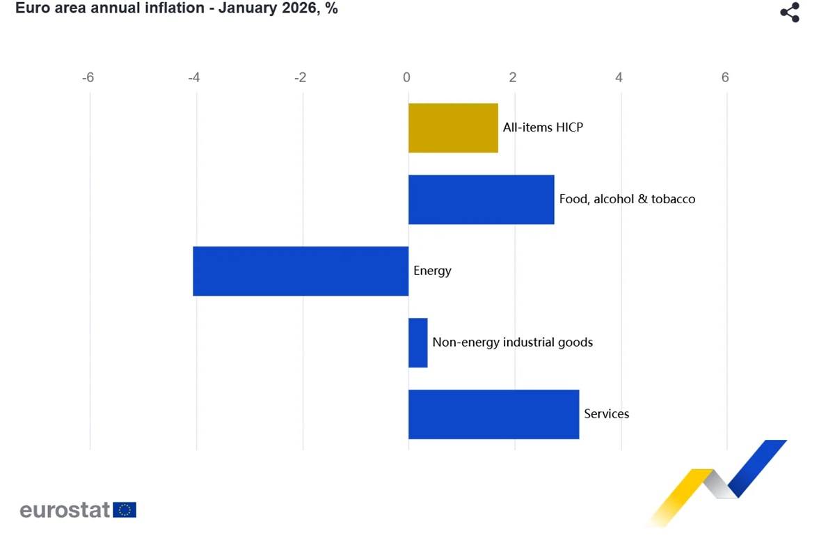 Όπως προκύπτει από τα στοιχεία της Eurostat, οι υπηρεσίες παραμένουν ο βασικός μοχλός διατήρησης των πληθωριστικών πιέσεων στην Ευρωζώνη, αν και παρουσίασαν μικρή κάμψη στο 3,2% τον Ιανουάριο από 3,4% τον Δεκέμβριο. Πιο περιορισμένη ήταν η συμβολή των τιμών σε τρόφιμα, αλκοόλ και καπνό, οι οποίες διαμορφώθηκαν στο 2,7% έναντι 2,5% τον προηγούμενο μήνα, ενώ τα μη ενεργειακά βιομηχανικά αγαθά κατέγραψαν οριακή επιτάχυνση στο 0,4%.