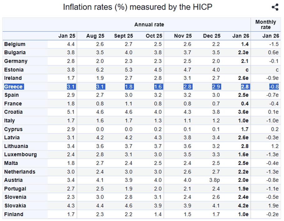 Όπως αναφέρθηκε και νωρίτερα, αξιοσημείωτη είναι η διαφορά στις πληθωριστικές τάσεις, μεταξύ Ελλάδας και ΕΕ: Στην Ελλάδα ο πληθωρισμός επιμένει, την ώρα που στην ΕΕ υποχωρεί. Για του λόγου το αληθές, η μέση ετήσια μεταβολή του Εναρμονισμένου Δείκτη Τιμών Καταναλωτή (ΕνΔΤΚ) διαμορφώθηκε στο 2,9% το 2025, από 3% το 2024. Στην ευρωζώνη καταγράφηκε αποκλιμάκωση στο 2,1%, δηλαδή σε ένα επίπεδο οριακά υψηλότερο του μεσοπρόθεσμου στόχου της Ευρωπαϊκής Κεντρικής Τράπεζας (ΕΚΤ), από 2,4% το 2024.