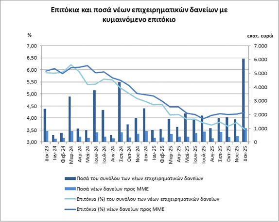Μικρή μείωση σημειώθηκε στην ψαλίδα νέων επιτοκίων και δανείων τον Δεκέμβριο, αν και παραμένει σε υψηλά επίπεδα. Σύμφωνα με την Τράπεζα της Ελλάδος (ΤτΕ) το περιθώριο μειώθηκε στο 3,93% από 4,34% τον Νοέμβριο. Τον Δεκέμβριο του 2025, το μέσο σταθμισμένο επιτόκιο των νέων καταθέσεων παρέμεινε αμετάβλητο στο 0,31%, ενώ το αντίστοιχο επιτόκιο των νέων δανείων μειώθηκε στο 4,24%.