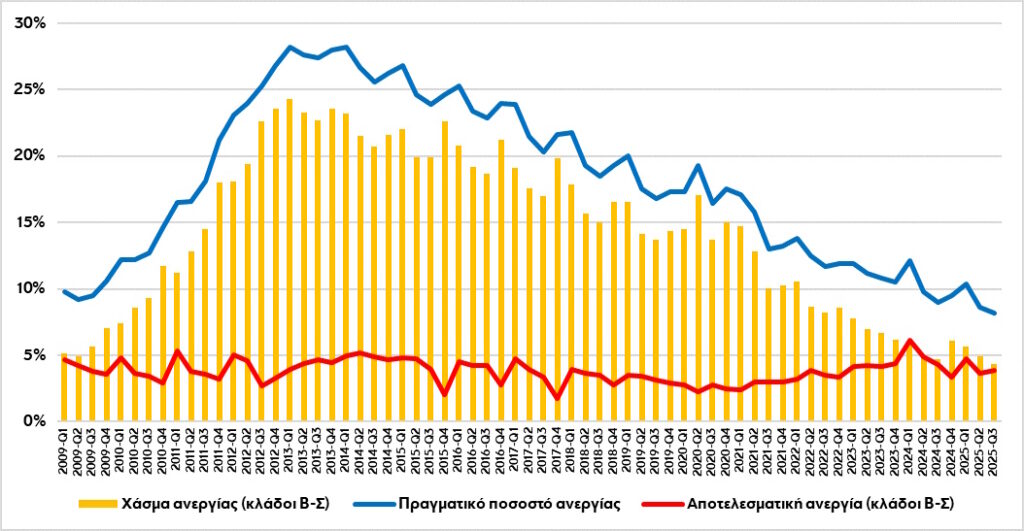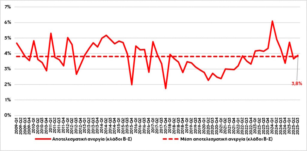 Χρησιμοποιώντας δεδομένα της Eurostat για το ποσοστό ανεργίας (u) και το ποσοστό κενών θέσεων εργασίας (v) στην Ελλάδα για την περίοδο α’ τρίμ. 2009-γ’ τρίμ. 2025, για τους κλάδους Β-Σ, δηλαδή για το σύνολο σχεδόν της οικονομίας, κατασκευάστηκε αρχικά η καμπύλη αποτελεσματικής ανεργίας. Σημειώνεται ότι το ποσοστό ανεργίας ορίζεται ως ο αριθμός των ανέργων προς το εργατικό δυναμικό και το ποσοστό κενών θέσεων εργασίας ορίζεται ως ο αριθμός των κενών θέσεων εργασίας προς το άθροισμα κενών θέσεων εργασίας και των κατειλημμένων θέσεων εργασίας.