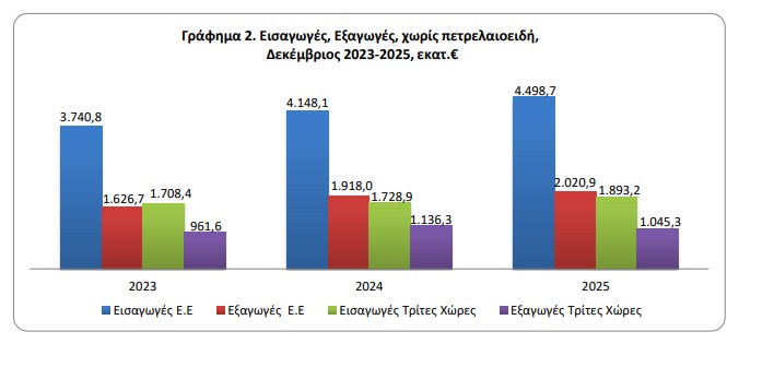 Το έλλειμμα του εμπορικού ισοζυγίου ανήλθε σε 3.552,5 εκατ. ευρώ έναντι 3.469,1 εκατ. ευρώ τον Δεκέμβριο 2024, παρουσιάζοντας αύξηση 2,4% (χωρίς τα πετρελαιοειδή υπήρξε αύξηση κατά 503,0 εκατ. ευρώ ή 17,8%, ενώ χωρίς τα πετρελαιοειδή και τα πλοία σημειώθηκε αύξηση κατά 472,1 εκατ. ευρώ ή 16,8%).