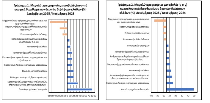 Ο δείκτης του κλάδου λοιπών ορυχείων και λατομείων, σημείωσε τη μεγαλύτερη ποσοστιαία αύξηση ενώ ο δείκτης του κλάδου κατασκευής μηχανοκίνητων οχημάτων, ρυμουλκούμενων και ημιρυμουλκούμενων οχημάτων, σημείωσε τη μεγαλύτερη ποσοστιαία μείωση, κατά τον Δεκέμβριο 2025 σε σχέση με τον Νοέμβριο 2025. Κατά τη σύγκριση των δεικτών του Δεκεμβρίου 2025 με τους αντίστοιχους δείκτες του Δεκεμβρίου 2024, η μεγαλύτερη ποσοστιαία αύξηση καταγράφηκε στον κλάδο λοιπών ορυχείων και λατομείων, ενώ η μεγαλύτερη ποσοστιαία μείωση καταγράφηκε στον κλάδο κατασκευής μηχανοκίνητων οχημάτων, ρυμουλκούμενων και ημιρυμουλκούμενων οχημάτων.