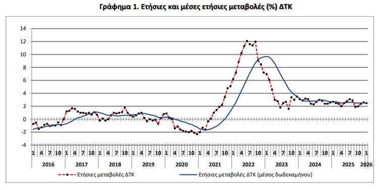 Ο ΕνΔΤΚ του μηνός Ιανουαρίου 2026, σε σύγκριση με τον αντίστοιχο Δείκτη του Ιανουαρίου 2025, παρουσίασε αύξηση 2,9% έναντι αύξησης 3,1% που σημειώθηκε κατά την αντίστοιχη σύγκριση του έτους 2025 με το 2024.