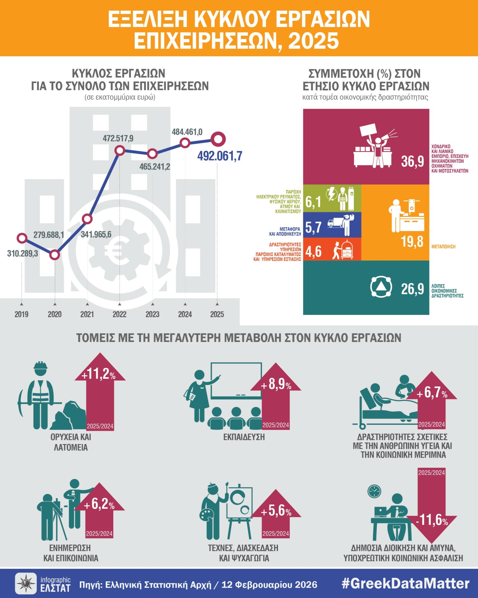Ο συνολικός τζίρος των επιχειρήσεων στην Ελλάδα αυξήθηκε κατά 1,6% το 2025, φτάνοντας τα 492,1 δισ. ευρώ έναντι 484, 46 δισ. ευρώ το 2024.