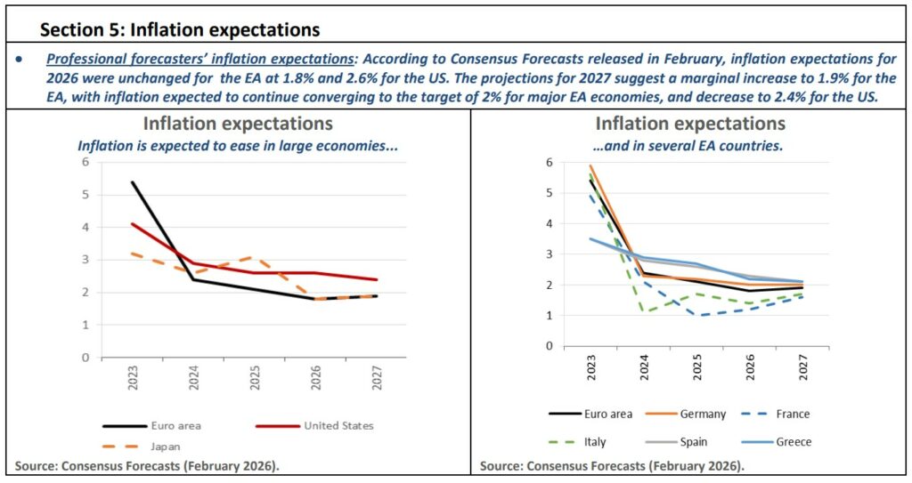 Παρά την πτωτική τάση των τιμών ενέργειας από το 2025, οι γεωπολιτικές αβεβαιότητες προκαλούν πρόσφατες ανατιμήσεις. Η έκθεση επισημαίνει ότι η στενότητα στην αγορά εργασίας διατηρεί τον πληθωρισμό των υπηρεσιών σε υψηλά επίπεδα, ενώ οι προβλέψεις για το 2026 αναμένουν περαιτέρω υποχώρηση του πληθωρισμού στην Ευρωζώνη προς το 1,9%.