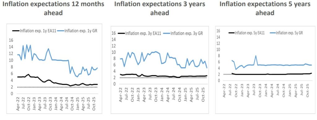 Ο πληθωρισμός στην ευρωζώνη βρίσκεται σε πτωτική τροχιά από τις αρχές του 2025, πλησιάζοντας τον στόχο της ΕΚΤ, χάρη στον αρνητικό πληθωρισμό της ενέργειας, ενώ ο πληθωρισμός στις υπηρεσίες και τα τρόφιμα παραμένει επίμονος. Ο πληθωρισμός στην Ελλάδα είναι υψηλότερος σε σύγκριση με τη ζώνη του ευρώ, κυρίως λόγω του ότι η οικονομία βρίσκεται σε διαφορετική φάση του επιχειρηματικού κύκλου.