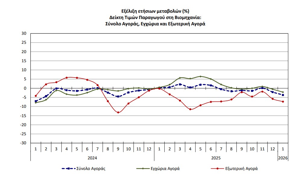 Ο Γενικός Δείκτης Τιμών Παραγωγού στη Βιομηχανία (σύνολο εγχώριας και εξωτερικής αγοράς), με έτος βάσης 2021=100,0 και μήνα αναφοράς τον Ιανουάριο 2026, σε σύγκριση με τον αντίστοιχο δείκτη του Ιανουαρίου 2025, παρουσίασε μείωση 3,7% έναντι αύξησης 0,3% που σημειώθηκε κατά την αντίστοιχη σύγκριση των δεικτών του έτους 2025 με το 2024.