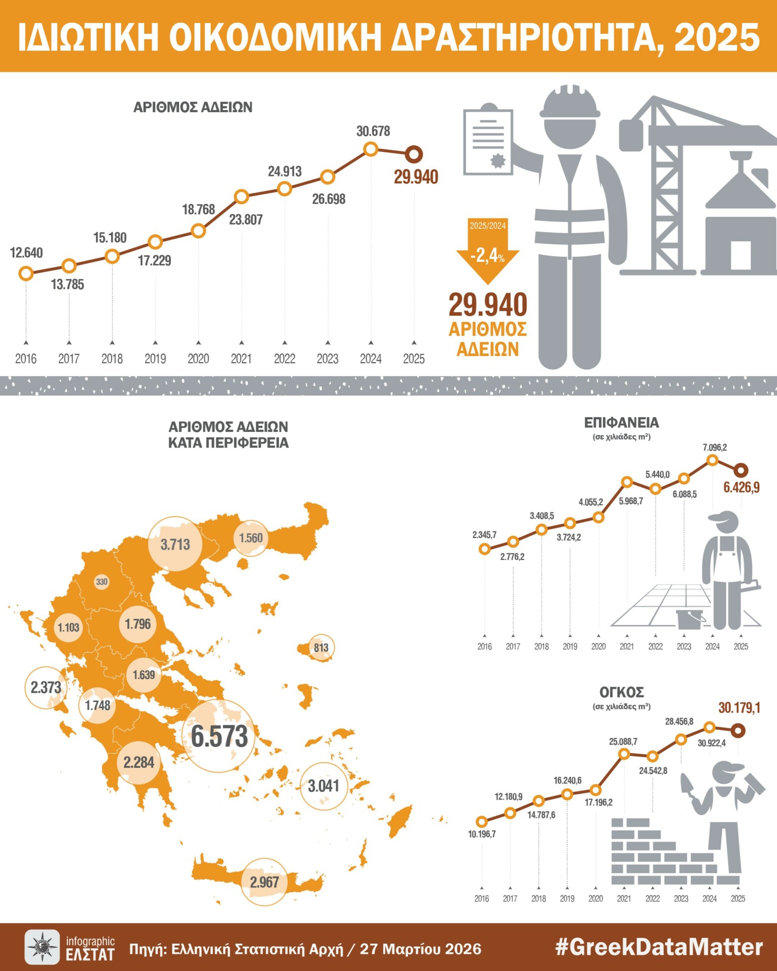 Κατά την περίοδο των τελευταίων δώδεκα μηνών, δηλαδή από τον Ιανουάριο 2025 έως τον Δεκέμβριο 2025, το μέγεθος της Συνολικής Οικοδομικής Δραστηριότητας (Ιδιωτικής-Δημόσιας) με βάση τις εκδοθείσες οικοδομικές άδειες, στο σύνολο της Χώρας, ανήλθε σε 30.199 οικοδομικές άδειες, που αντιστοιχούν σε 6.574.883 m2 επιφάνειας και 31.043.957 m3όγκου. Σε σχέση με την αντίστοιχη περίοδο Ιανουαρίου – Δεκεμβρίου 2024 παρατηρήθηκε μείωση κατά 2,6% στον αριθμό των οικοδομικών αδειών, μείωση κατά 9,7% στην επιφάνεια και μείωση κατά 3,0% στον όγκο.