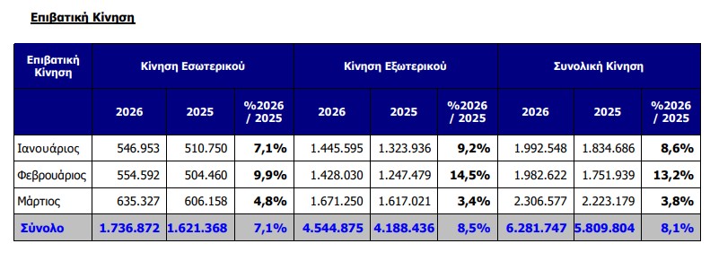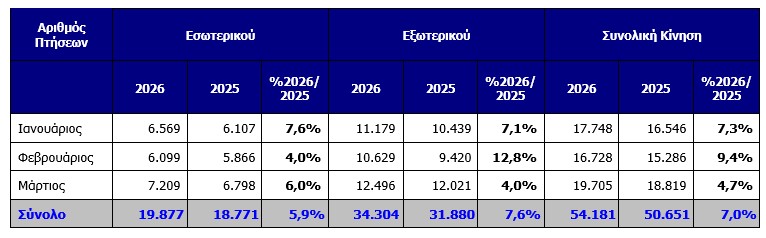 Σημείωση: Τα στατιστικά κίνησης του Μαρτίου 2026 είναι προκαταρκτικά και ενδέχεται να αλλάξουν. Τα στοιχεία κίνησης του κάθε μήνα οριστικοποιούνται μετά την 20η του επόμενου μήνα.