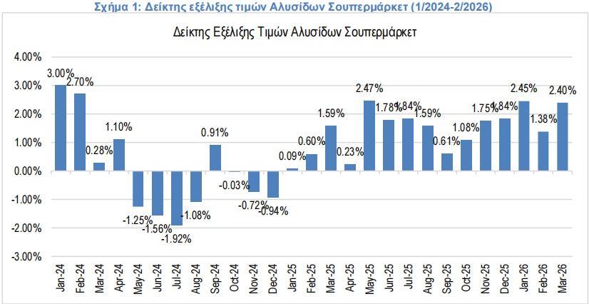 Στο 2,4% διαμορφώθηκε ο πληθωρισμός στα σούπερ μάρκετ τον Μάρτιο 2026 σε σχέση με τον Μάρτιο 2025, σύμφωνα με έρευνα του Ινστιτούτου Έρευνας Λιανεμπορίου Καταναλωτικών Αγαθών (ΙΕΛΚΑ).