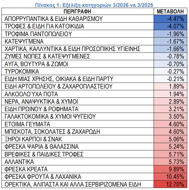 Μεγαλύτερες μειώσεις τιμών τον Μάρτιο 2026 σε σχέση με τον Μάρτιο 2025 καταγράφονται στις κατηγορίες: Απορρυπαντικά και είδη καθαρισμού: -4,47%, Τροφές και είδη για κατοικίδια: -4,07%, Τρόφιμα παντοπωλείου: -1,96%, Κατεψυγμένα: -1,67% και Χαρτικά, καλλυντικά και είδη προσωπική φροντίδας: -1,66%