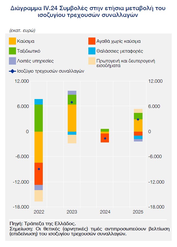 Εν κατακλείδι, το 2026, λόγω του πολέμου στη Μέση Ανατολή, το έλλειμμα του ισοζυγίου τρεχουσών συναλλαγών δεν αναμένεται να καταγράψει περαιτέρω βελτίωση, αναφέρει η ΤτΕ. «Η άνοδος των τιμών της ενέργειας εκτιμάται ότι θα επιδράσει αρνητικά στο ισοζύγιο καυσίμων», αναφέρει χαρακτηριστικά, σημειώνοντας ότι «αν και οι εξαγωγές αγαθών χωρίς τα καύσιμα, παρά τις γεωπολιτικές εξελίξεις, κατέγραψαν άνοδο και διατήρησαν το μερίδιο αγοράς τους στους κύριους προορισμούς το 2025, τυχόν πραγματοποίηση των καθοδικών κινδύνων στην παγκόσμια ανάπτυξη, καθώς και στην εξωτερική ζήτηση για τα ελληνικά προϊόντα, θα έχουν περαιτέρω αρνητική συμβολή στο ισοζύγιο τρεχουσών συναλλαγών.