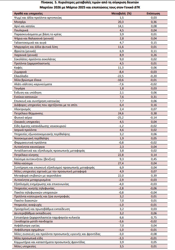 Η αύξηση του Γενικού ΔΤΚ κατά 2,6% τον μήνα Μάρτιο 2026, σε σύγκριση με τον αντίστοιχο Δείκτη του Φεβρουαρίου 2026, προήλθε κυρίως από τις μεταβολές στις ακόλουθες ομάδες αγαθών και υπηρεσιών:
