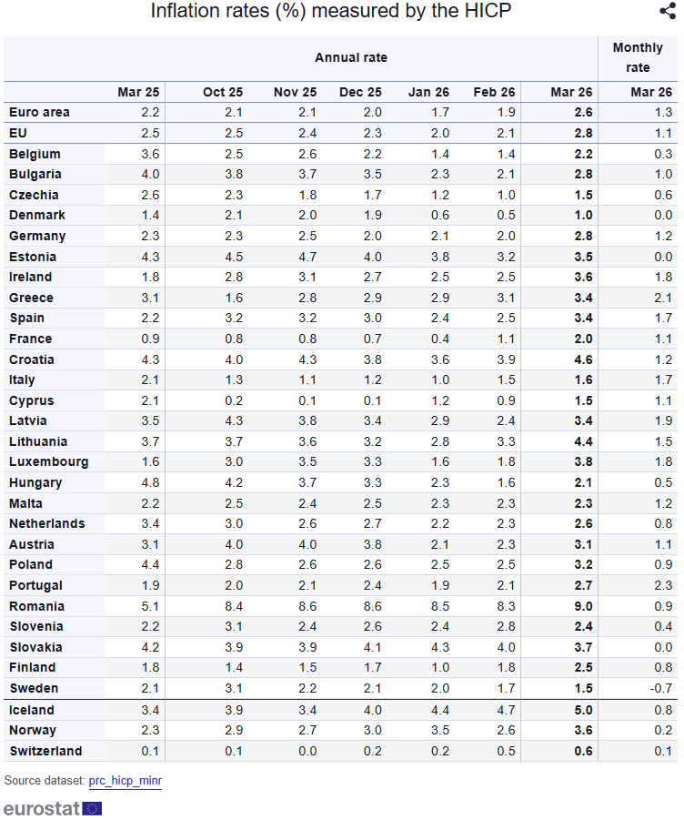 Στο 3,4% ανήλθε ο πληθωρισμός στην Ελλάδα τον Μάρτιο, σύμφωνα με τη Eurostat,έναντι πρώτης εκτίμησης της Eurostat για 3,3%, μία ημέρα μετά τις ανακοινώσεις της ΕΛΣΤΑΤ. Ο ετήσιος πληθωρισμός στην Ευρωζώνη αναθεωρήθηκε υψηλότερα στο 2,6% τον Μάρτιο του 2026, το υψηλότερο επίπεδο από τον Ιούλιο του 2024, έναντι προκαταρκτικής εκτίμησης για 2,5% και από 1,9% τον Φεβρουάριο.