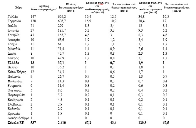 Υποσημειώσεις του αρχικού πίνακα: ¹ Με περιουσία άνω του 1 δισ. ευρώ. ² Με περιουσία άνω των 100 εκατ. ευρώ.