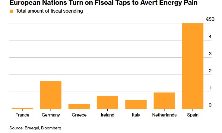 Όπως φαίνεται στο γράφημα του Bloomberg, σε εθνικό επίπεδο, η Ισπανία καταγράφει τη μεγαλύτερη δημοσιονομική παρέμβαση, περίπου 5 δισ. ευρώ. Ακολουθούν η Γερμανία με σχεδόν 1,5 δισ. ευρώ και η Ολλανδία με περίπου 1 δισ. ευρώ. Η Ιρλανδία έχει διαθέσει περί τα 0,6 δισ. ευρώ, η Ιταλία περίπου 0,4 δισ. ευρώ, ενώ η Ελλάδα έχει διαθέσει γύρω στα 0,2 δισ. ευρώ. Η Γαλλία εμφανίζει μέχρι στιγμής περιορισμένη παρέμβαση.