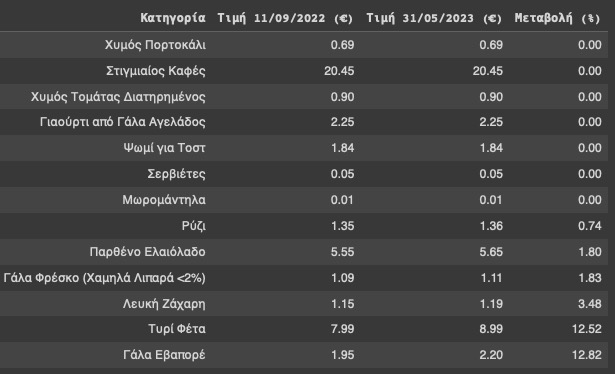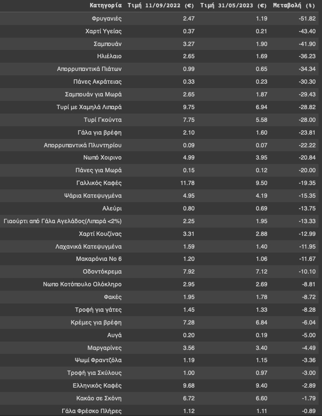 Οι μειώσεις στις τιμές ήταν έως και εντυπωσιακές. Για παράδειγμα, η μεγαλύτερη μείωση καταγράφηκε στις φρυγανιές, πάνω από 50%. Ακολούθησαν μειώσεις της τάξης του 40%-50% σε χαρτί υγείας και σαμπουάν και της τάξης από 30%-40% σε πάνες ακράτειας, απορρυπαντικά πιάτων και ηλιέλαιο. Από την άλλη πλευρά, οι μεγαλύτερες αυξήσεις καταγράφηκαν στη φέτα και το γάλα εβαπορέ, άνω του 10%.