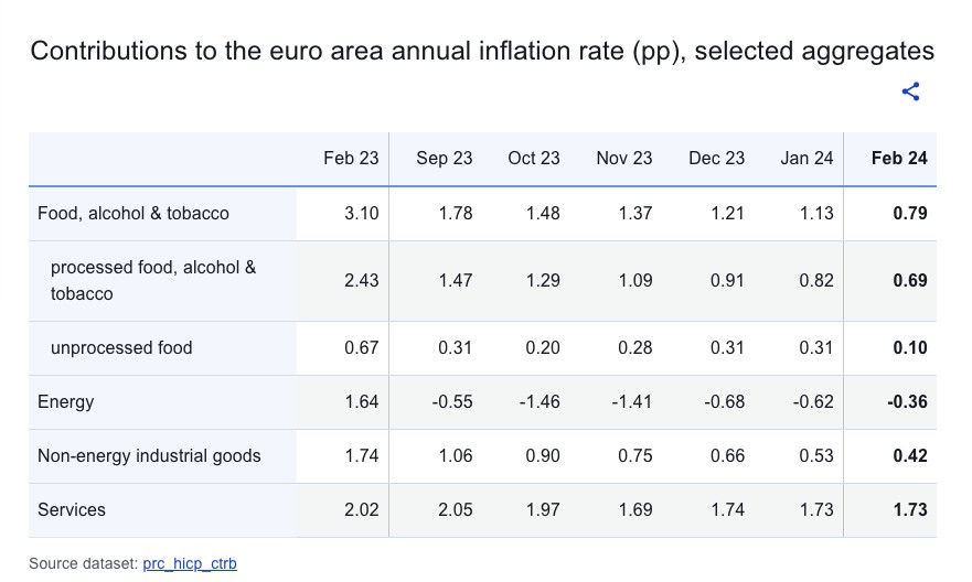 Τον Φεβρουάριο, η υψηλότερη συμβολή στον ετήσιο ρυθμό πληθωρισμού της ζώνης του ευρώ προήλθε από τις υπηρεσίες (+1,73 ποσοστιαίες μονάδες, π.μ.), ακολουθούμενες από τα τρόφιμα, το αλκοόλ και τον καπνό (+0,79 π.μ.), τα μη ενεργειακά βιομηχανικά αγαθά (+0,42 π.μ.) και την ενέργεια. (-0,36 pp).