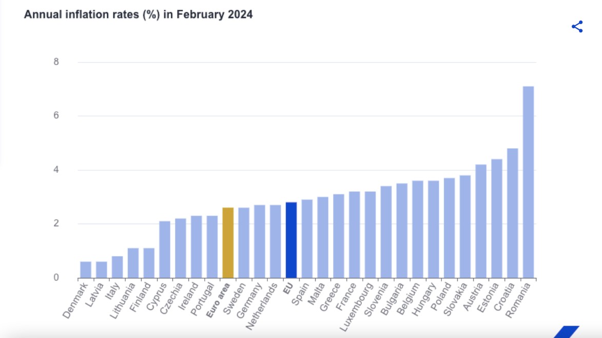 Τα χαμηλότερα ποσοστά καταγράφηκαν στη Λετονία, τη Δανία (0,6%) και την Ιταλία (0,8%). Τα υψηλότερα ετήσια ποσοστά καταγράφηκαν στη Ρουμανία (7,1%), στην Κροατία (4,8%) και στην Εσθονία (4,4%). Σε σύγκριση με τον Ιανουάριο, ο ετήσιος πληθωρισμός μειώθηκε σε είκοσι κράτη μέλη, παρέμεινε σταθερός σε πέντε και αυξήθηκε σε δύο.
