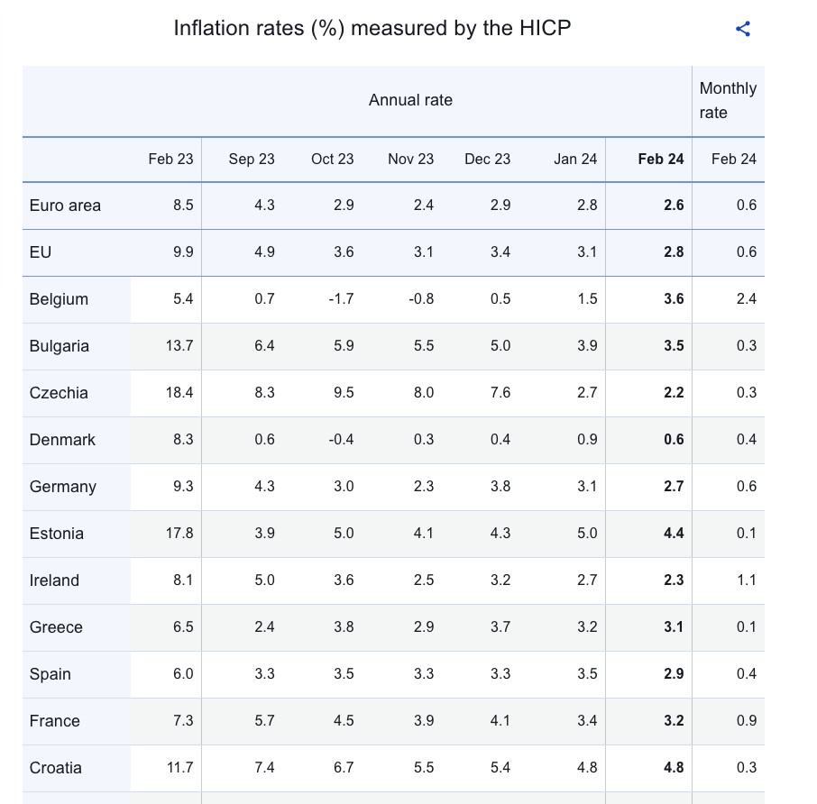 Αντίστοιχα, ο ετήσιος ρυθμός πληθωρισμού στη Ευρωζώνη κυμάνθηκε στο 2,6% τον μήνα Φεβρουάριο του 2024, πέφτοντας κατά 0,2% από 2,8% τον Ιανουάριο. Και εδώ, πριν από έναν χρόνο, ο πληθωρισμός βρισκόταν στο 8,5%!