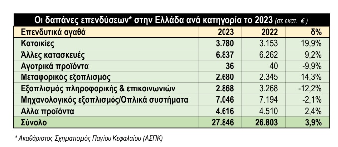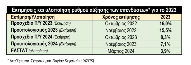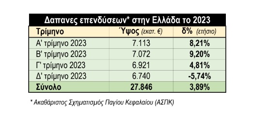 «Αν και από υψηλότερη βάση αναφοράς», αναφέρει η έκθεση του ΓΠτΒ, «οι τελευταίες (επενδύσεις πάγιου κεφαλαίου) σημείωσαν πτώση κατά 5,7% σε σχέση με το τέταρτο τρίμηνο του 2022, ενώ για το έτος συνολικά αυξήθηκαν κατά 4,0%».