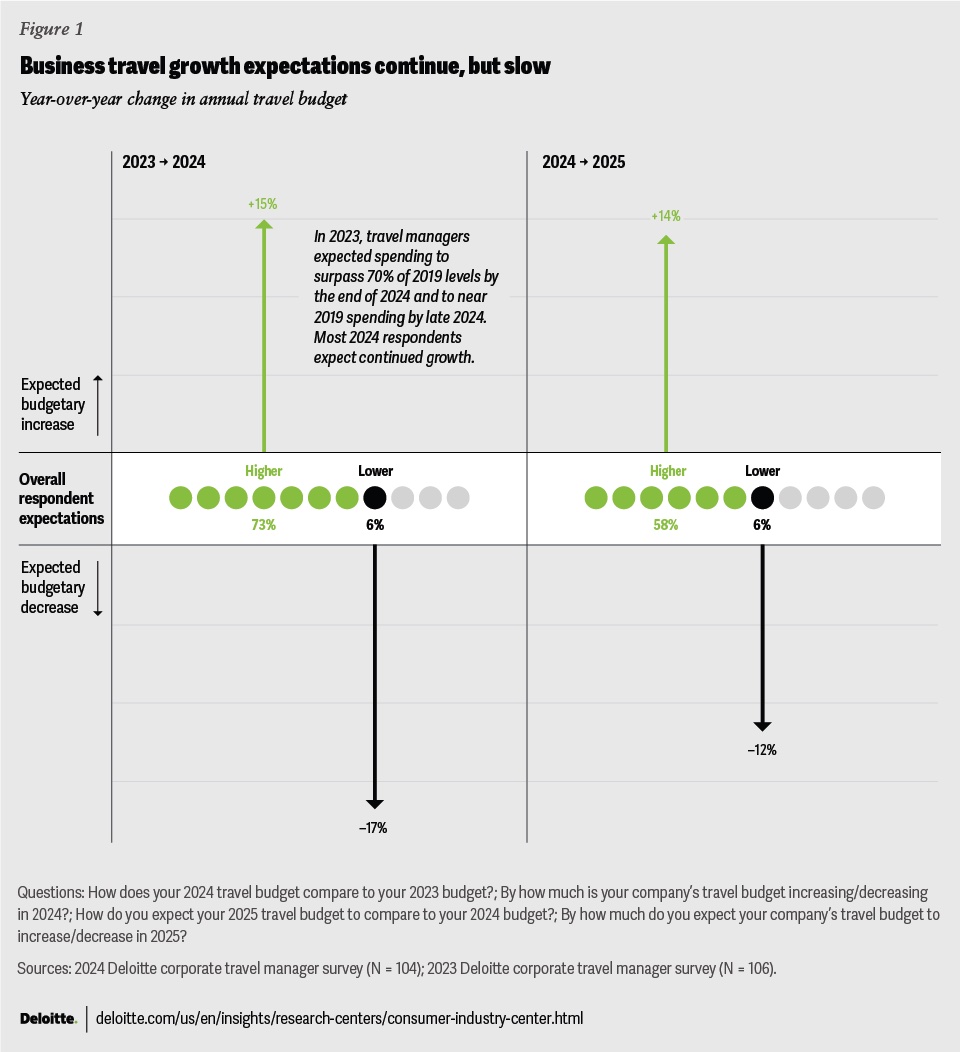 Τα ταξίδια αναψυχής ανέκαμψαν σχεδόν αμέσως μετά το τέλος της πανδημίας του Covid 19. Δεν συνέβη το ίδιο και για τα επαγγελματικά ταξίδια, που αποτελούν μεγάλο έσοδο για τις αεροπορικές, τα ξενοδοχεία και όλη την τουριστική αλυσίδα. Οι τηλεδιασκέψεις μέσω Zoom και άλλων εφαρμογών είχαν ήδη αντικαταστήσει τις διά ζώσης συναντήσεις, εξοικονομώντας και αρκετά για τις εταιρείες. Πλέον, όμως, φαίνεται ότι και τα επαγγελματικά ταξίδια επιστρέφουν! Σύμφωνα με έρευνα της Deloitte, σχεδόν τρία στα τέσσερα στελέχη εταιρειών που χειρίζονται τα εταιρικά ταξίδια αναμένουν πως οι εταιρείες τους θα αυξήσουν τα έξοδα για επαγγελματικά ταξίδια φέτος, ενώ σχεδόν πέντε στα έξι εκτιμούν πως θα σημειωθεί νέα αύξηση το 2025. Και οι δύο αυτές αυξήσεις υπολογίζονται σε 15% εκάστη.