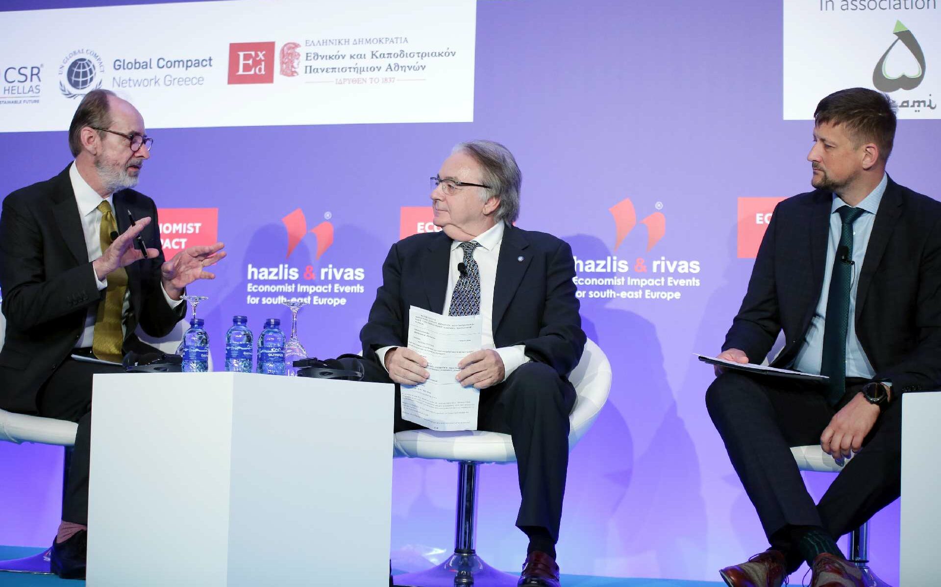 Στη διάρκεια του Ninth Sustainability Summit for SE Europe & the Mediterranean του Economist, ο Ansis Zeltiņš, πρόεδρος της European Sea Ports Organisation (ESPO), και ο Απόστολος Καμαρινάκης, πρόεδρος της Ελληνικής Ένωσης Λιμένων (ΕΛΙΜΕ), έδωσαν ξεκάθαρες εικόνες για το πώς κινείται ο κλάδος της ναυτιλίας στην Ελλάδα και στην Ευρώπη, και πώς η αλληλεπίδραση πολιτικής, επιχειρηματικότητας και κοινωνίας θα κρίνει το αποτέλεσμα καθώς και για τις προκλήσεις και τις ευκαιρίες που ανοίγονται μπροστά στους λιμένες.