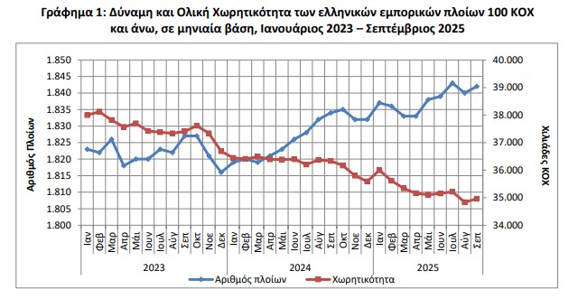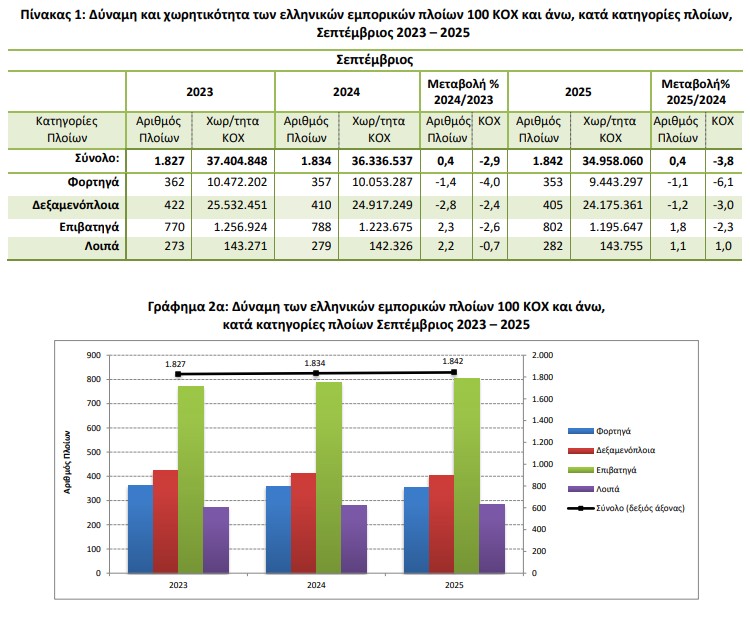Η Ολική Χωρητικότητα του Ελληνικού Εμπορικού Στόλου, από πλοία 100 ΚΟΧ και άνω, παρουσίασε μείωση κατά 3,8% τον μήνα Σεπτέμβριο 2025 σε σύγκριση με την αντίστοιχη χωρητικότητα του Σεπτεμβρίου 2024. Μείωση 2,9% είχε σημειωθεί και κατά την αντίστοιχη σύγκριση του Σεπτεμβρίου του έτους 2024 προς τον Σεπτέμβριο 2023.