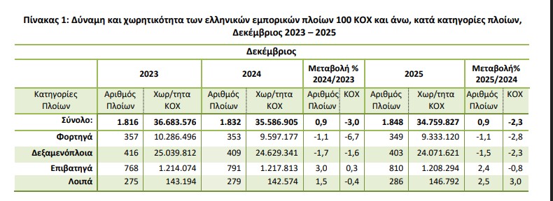 - Η Ολική Χωρητικότητα του Ελληνικού Εμπορικού Στόλου, από πλοία 100 ΚΟΧ και άνω, παρουσίασε μείωση κατά 2,3% τον μήνα Δεκέμβριο 2025 σε σύγκριση με την αντίστοιχη χωρητικότητα του Δεκεμβρίου 2024. Μείωση 3,0 % είχε σημειωθεί και κατά την αντίστοιχη σύγκριση του Δεκεμβρίου του έτους 2024 προς τον Δεκέμβριο 2023.
