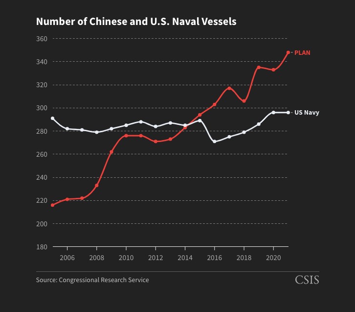 Το ναυτικό του Λαϊκού Απελευθερωτικού Στρατού (PLAΝ στο παραπάνω σχήμα) ήδη κατέχει τον μεγαλύτερο στόλο του πλανήτη σε αριθμούς πλοίων και η τεχνολογική εξέλιξη του στόλου αυτού συνεχίζεται με ταχείς ρυθμούς. Δεν είναι τυχαίο πως τον Νοέμβριο του 2020, όταν ο Αμερικανός πρόεδρος, Ντόναλντ Τραμπ, υπέγραψε εκτελεστική εντολή, επιβάλλοντας κυρώσεις σε 31 εταιρείες που συνδέονταν με το κινεζικό ναυτικό, η CSSC ήταν μία από αυτές.