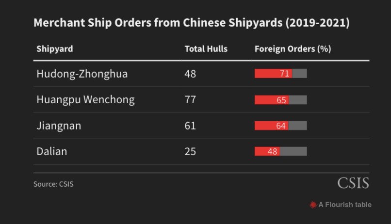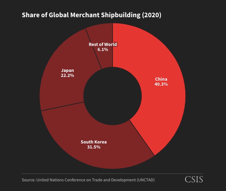 Όπως υποστηρίζουν κινεζικά ειδησεογραφικά μέσα, το 2023 τα κινεζικά ναυπηγεία παρέδωσαν το 49% των πλοίων που παραδόθηκαν παγκοσμίως, το διάστημα Ιανουαρίου-Σεπτεμβρίου, και εξασφάλισαν το 68,8% των νέων παραγγελιών. Το 2022 η Clarkson Research ανέφερε πως τα κινεζικά ναυπηγεία κέρδισαν παραγγελίες για 1,12 εκατομμύρια CGT (72 νέα πλοία), το 57% του παγκόσμιου συνόλου. Σύμφωνα με στοιχεία από τη Διάσκεψη των Ηνωμένων Εθνών για το Εμπόριο και την Ανάπτυξη (UNCTAD), που παρουσιάζει το CSIS, το 2020 η Κίνα ήλεγχε το 40,3% της παγκόσμιας αγοράς, η Νότια Κορέα το 31,5%, η Ιαπωνία το 22,2% και τα ναυπηγεία του υπόλοιπου πλανήτη μόλις το 6,1%.
