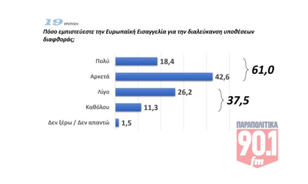 Η γενικευμένη δυσπιστία καταρρακώνει και την αξιοπιστία του θεσμού της ελληνικής δικαιοσύνης, με μόνο το 28,2% να δηλώνει ότι την εμπιστεύεται, σε αντίθεση με την ευρωπαϊκή εισαγγελία, της οποίας ο βαθμός εμπιστοσύνης των Ελλήνων φτάνει στο 61%, με τους περισσότερους να έχουν εναποθέσει στο κοινοτικό όργανο τις προσδοκίες για τη διαλεύκανση των υποθέσεων που ταλανίζουν τη χώρα.