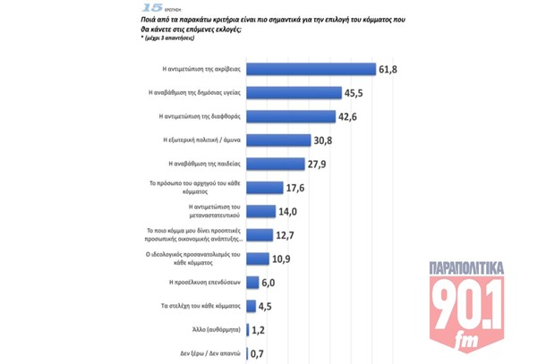 Oι θέσεις των κομμάτων, σύμφωνα με τη δημοσκόπηση συνιστούν το σημαντικότερο κριτήριο επιλογής για το 58,1% του εκλογικού σώματος, με την αντιμετώπιση της ακρίβειας (61,8%), την αναβάθμιση της δημόσιας υγείας (45,5%) και τον περιορισμό της διαφθοράς (42,6%) να αποτελούν τις βασικές προτεραιότητες των πολιτών στην ατζέντα που επηρεάζει και καθορίζει τις επιλογές τους.