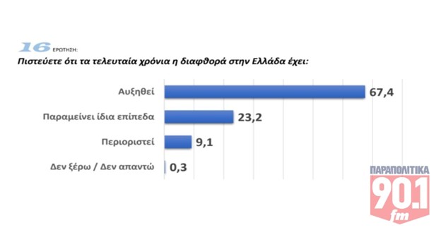 Εκτός της ακρίβειας, που σταθερά απασχολεί την πλειοψηφία των πολιτών τα τελευταία χρόνια, το ζήτημα της διαφθοράς εξελίσσεται σε κορυφαίο πρόβλημα για την κυβερνητική παράταξη, με το 67,4% να πιστεύει ότι επί των ημερών της τα φαινόμενα διαφθοράς έχουν διογκωθεί και έχουν διαβρώσει πολλαπλές πτυχές του δημόσιου βίου. Την ίδια στιγμή, η μεγάλη πλειοψηφία, με 73,8%, θεωρεί ότι αυτές ακριβώς τις περιπτώσεις η κυβέρνηση προσπαθεί να τις συγκαλύψει και όχι να τις φωτίσει, γεγονός που συντηρεί το αίσθημα ατιμωρησίας και ασυδοσίας που έχει εμπεδωθεί στην κοινή γνώμη από την τραγωδία των Τεμπών και το σκάνδαλο του ΟΠΕΚΕΠΕ.