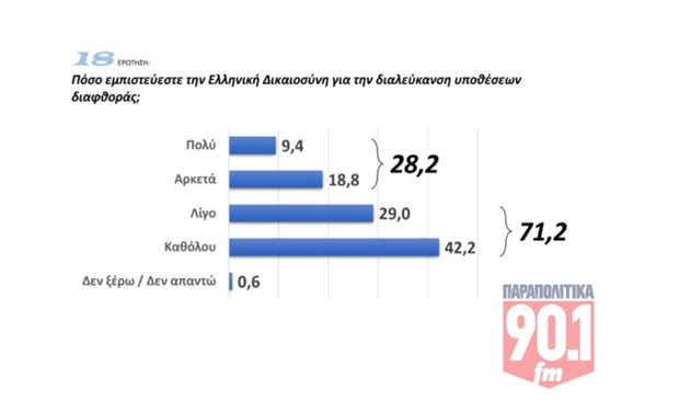 Η γενικευμένη δυσπιστία καταρρακώνει και την αξιοπιστία του θεσμού της ελληνικής δικαιοσύνης, με μόνο το 28,2% να δηλώνει ότι την εμπιστεύεται, σε αντίθεση με την ευρωπαϊκή εισαγγελία, της οποίας ο βαθμός εμπιστοσύνης των Ελλήνων φτάνει στο 61%, με τους περισσότερους να έχουν εναποθέσει στο κοινοτικό όργανο τις προσδοκίες για τη διαλεύκανση των υποθέσεων που ταλανίζουν τη χώρα.