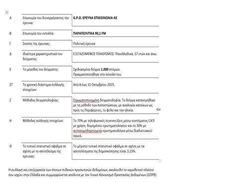 Την ακρίβεια, την υγεία και τη διαφθορά ως τα κορυφαία προβλήματα που απασχολούν τους πολίτες αναδεικνύει το δεύτερο μέρος της δημοσκόπησης της GPO για τα Παραπολιτικά 90,1. Η δημοσκόπηση δείχνει ότι η ιδεολογία των κομμάτων χάνει έδαφος , το αφήγημα του «χαρισματικού ηγέτη» καταρρίπτεται. Στο επίκεντρο βρίσκονται οι αναποφάσιστοι, οι οποίοι, σύμφωνα με τα ευρήματα, αναδεικνύονται σε καθοριστικό στοιχείο για την έκβαση των εκλογών, ενώ η εμπιστοσύνη στους θεσμούς, όπως η Δικαιοσύνη, εμφανίζεται σημαντικά μειωμένη.